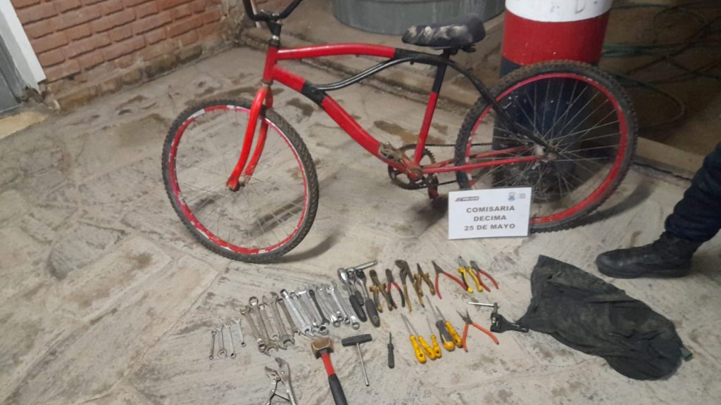 El sospechoso abandonó una bicicleta playera rodado 26 de color rojo con detalles negros y una remera envuelta que contenía una gran variedad de herramientas. En total, los efectivos hallaron más de 30 elementos: llaves de distintas marcas (Irom, Tramontina, Starley), destornilladores, pinzas, alicates, criques y otras herramientas específicas que suelen usarse en trabajos mecánicos o ilícitos.