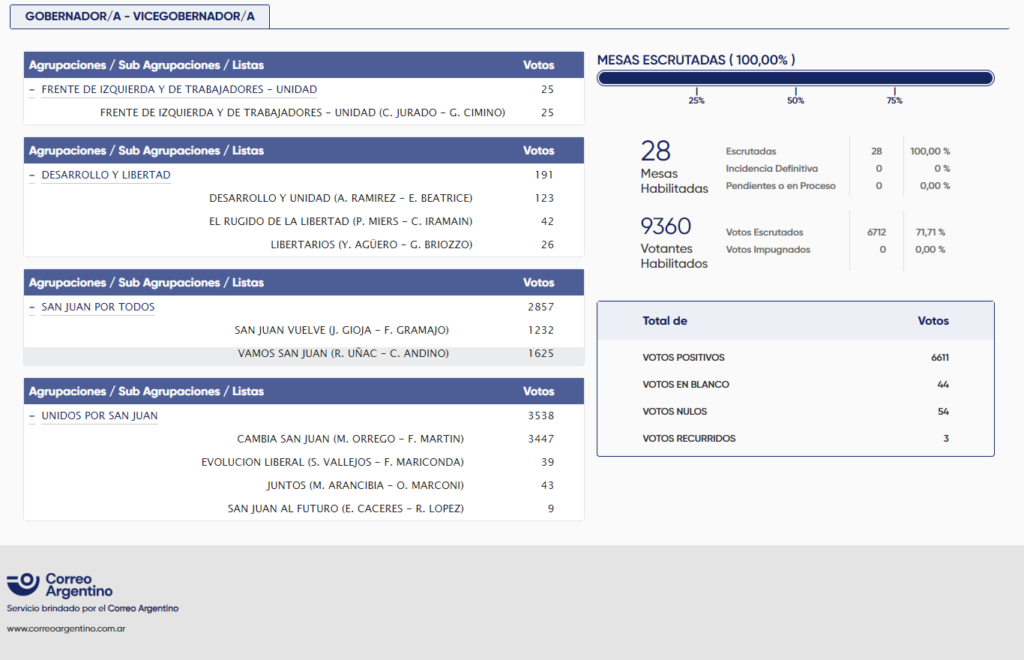 Mientras que la Agrupación San Juan por Todos obtuvo 2.857 votos, el candidato a gobernador Rubén Uñac recibió 1.625 votos y la fórmula encabezada por José Luis Gioja obtuvo 1.232 votos.