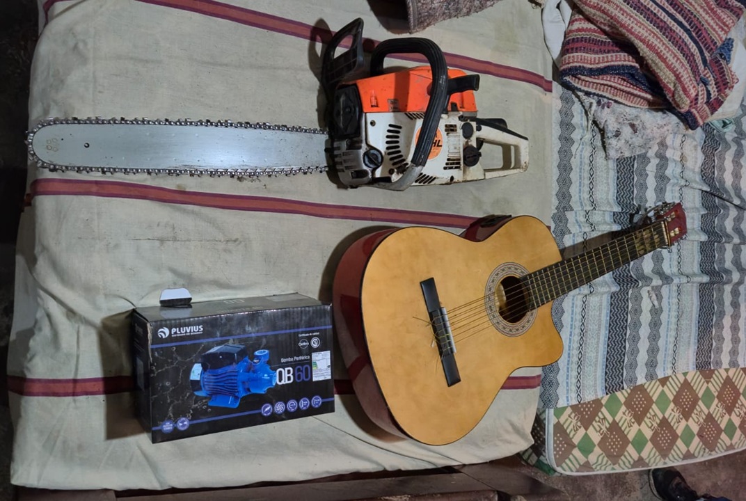 Al verificar la propiedad, constató que una ventana del sector sur había sido violentada, y que autores desconocidos le habían robado diversos objetos: una motosierra Stihl de color naranja con blanco, una guitarra criolla y una bomba periférica QB60 marca Plubius, de color azul.