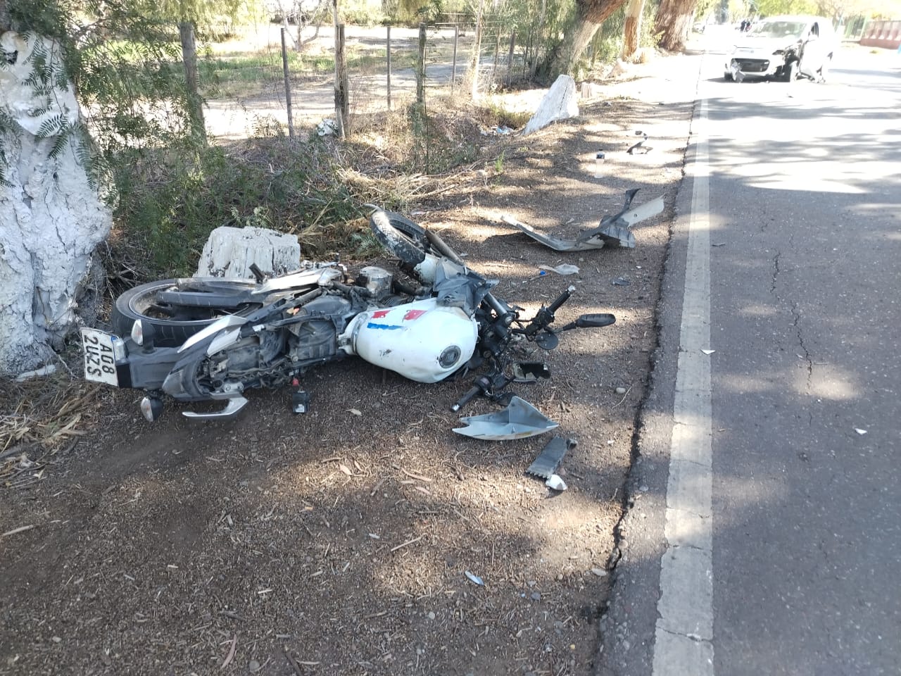 Un grave accidente de tránsito sacudió la tarde de este sábado en Albardón, cuando una moto policial colisionó de frente con un auto y terminó involucrando también a dos peatones que esperaban el colectivo en la zona.