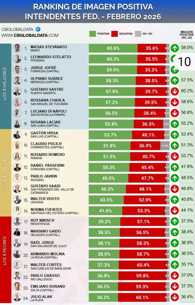 En términos generales, la dirigente del espacio Producción y Trabajo alcanzó un 55,2% de aprobación de gestión, lo que le permitió ubicarse en el octavo lugar del ranking nacional. De esta manera, Laciar se mantiene dentro del grupo de los diez intendentes mejor valorados del país y reafirma su posicionamiento como la primera mujer en conducir la Capital sanjuanina con altos niveles de respaldo ciudadano.