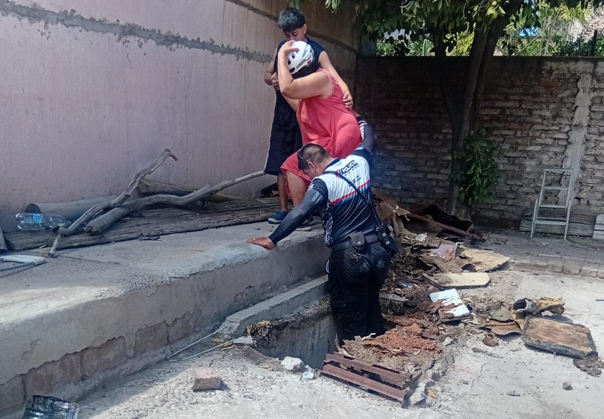 El operativo de rescate estuvo a cargo del cabo Irrazábal Rolando y la agente Mattus Florencia, quienes lograron poner a salvo a la damnificada tras la caída en el antiguo sótano de la vivienda.