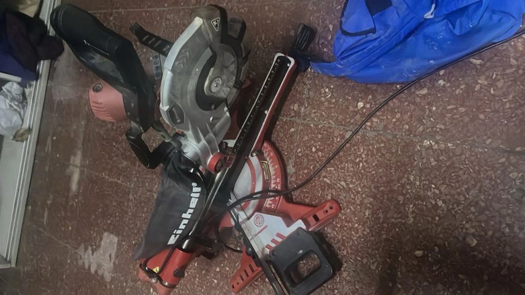 La sierra ingletadora robada fue hallada en calle Hoiggin, a unos 20 metros de Avenida Rawson, lugar donde uno de los acusados habría intentado recuperarla tras descartarla.