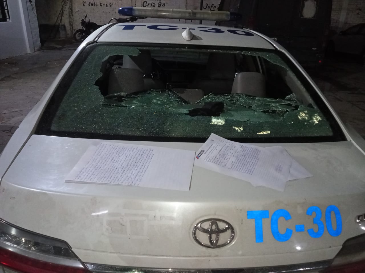 Minutos después, móviles del Comando Radioeléctrico Este iniciaron un operativo de búsqueda en barrios cercanos, detectando a los sospechosos en barrio Nikizanga. Al intentar ingresar para detenerlos, los efectivos fueron recibidos con violencia: una piedra impactó contra un patrullero Toyota Corolla (H-30), destrozando por completo la luneta trasera.