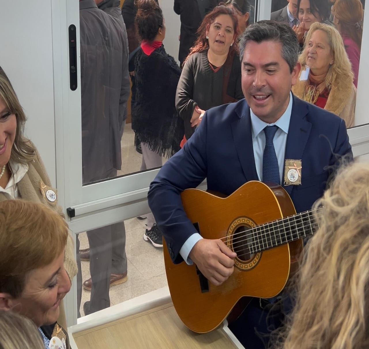 Mientras recorría las nuevas instalaciones, el mandatario ingresó a un aula y encontró una guitarra apoyada en una esquina. Sin pensarlo dos veces, la tomó, retiró la funda y comenzó a probar algunos acordes. Fue entonces cuando una de las docentes inició la tradicional frase de coplas: “Ayer pasé por su casa…”.