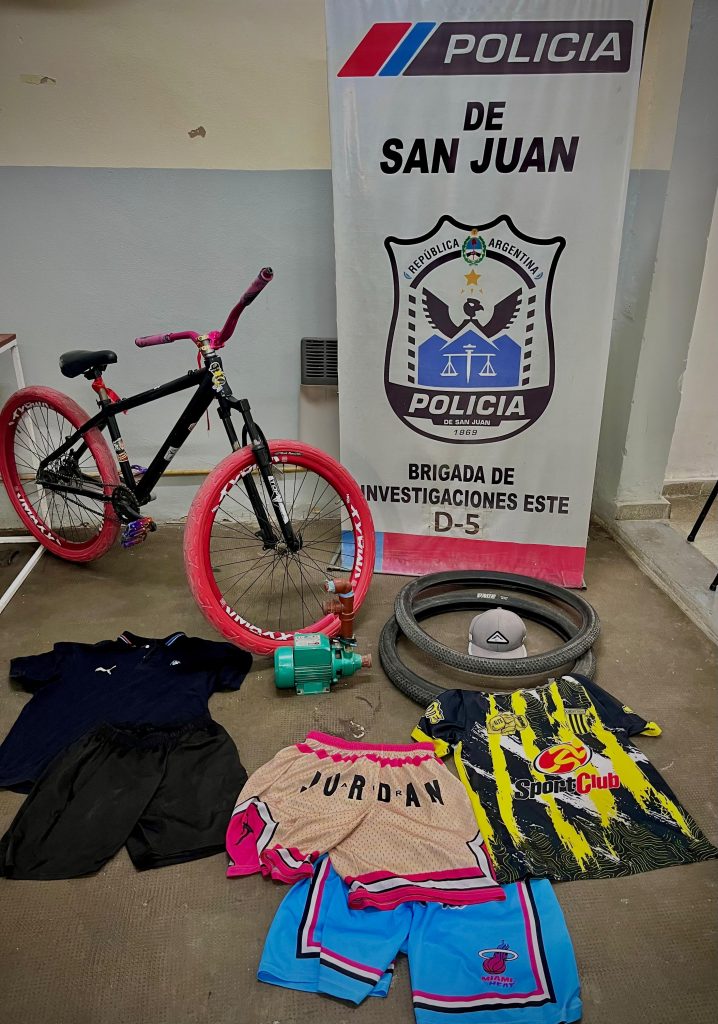Entre los elementos recuperados se encuentran una bomba de extracción de agua, una gorra Nike, teléfonos celulares, ropa deportiva y una bicicleta, todos denunciados como sustraídos en el hecho.