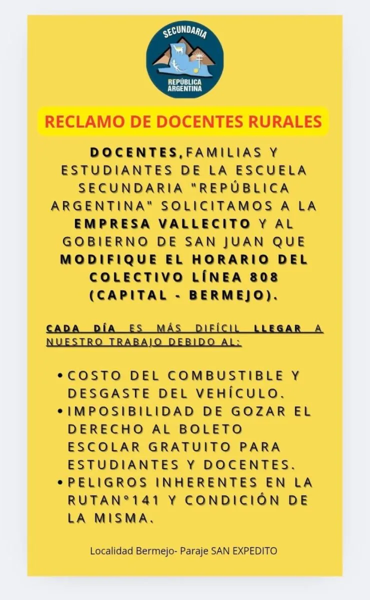 Docentes de la Escuela Secundaria República Argentina, en Bermejo (Caucete), piden modificar los horarios de la línea 808 de la empresa Vallecito, ya que no coinciden con las clases.