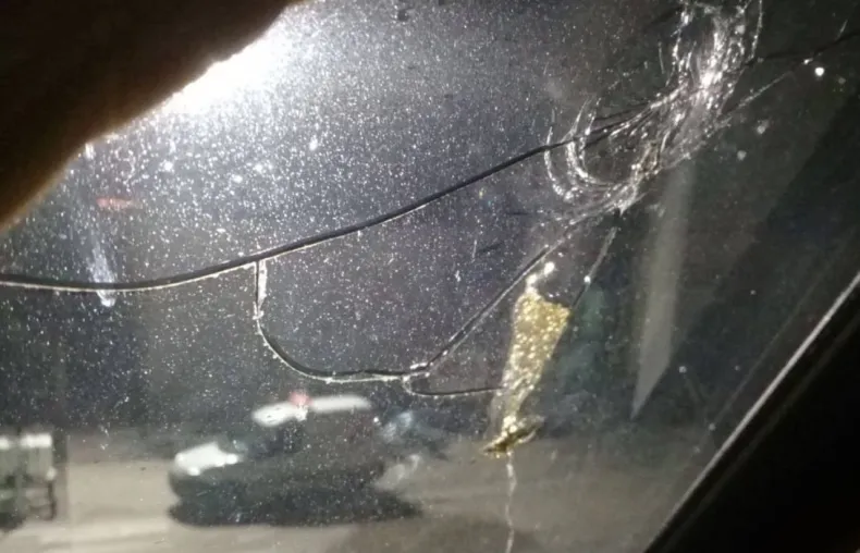 En cuestión de segundos, uno de los elementos impactó de lleno contra el parabrisas, provocando su destrucción total. El ataque generó pánico y tensión dentro del vehículo, ya que ocurrió mientras estaban en movimiento.