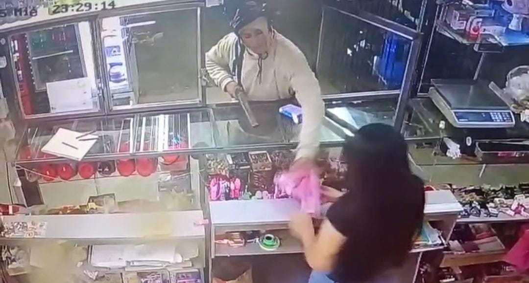 El hecho ocurrió en la zona de calle El Paisano, antes de avenida Los Pinos. Según las imágenes, un hombre llegó en moto y fingió ser un cliente más. Luego de pedir varios productos con total tranquilidad, cuando llegó el momento de pagar sacó un arma de fabricación casera, conocida como “tumbera”, y apuntó directamente a la joven que lo atendía.