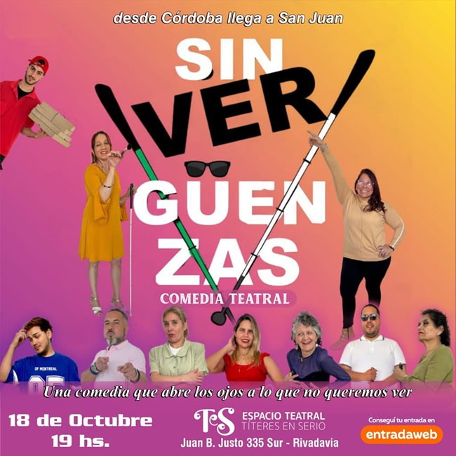 El joven director y actor sanjuanino Jairo Gentile regresa a su provincia con una propuesta teatral que rompe moldes y despierta sentidos. Se trata de “Sin Ver-guenzas”, una comedia que aborda la inclusión desde una mirada artística y humana, protagonizada por personas ciegas o con baja visión. La obra se presentará el 18 de octubre a las 19 horas en el Espacio Teatral TeS, ubicado en Juan B. Justo 335 Sur, Rivadavia.