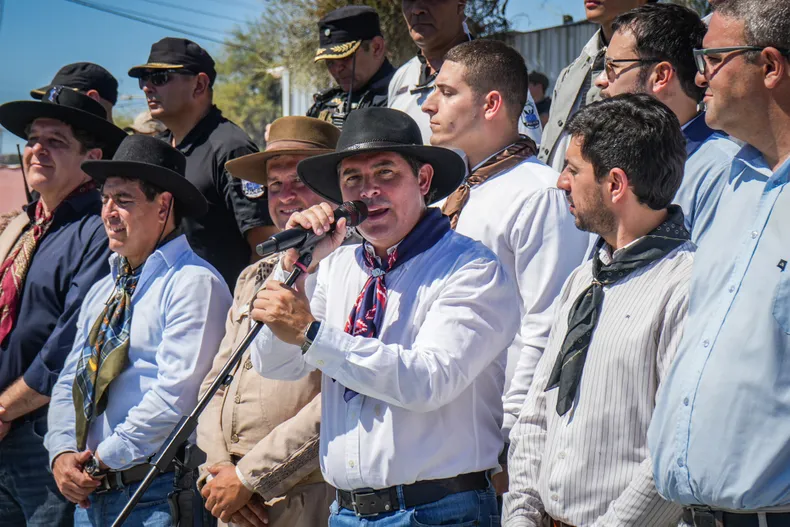 Luego de arribar a caballo junto a la columna, el mandatario participó del acto oficial frente a la capilla, donde brindó su discurso ante los presentes.