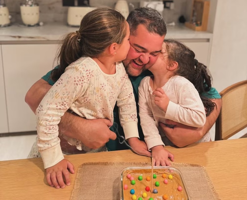 El ambiente familiar se reforzó aun más con otra postal: Barassi, vistiendo una remera verde, abrazó a sus dos hijas pequeñas en la cocina. Una de las niñas, con el cabello recogido y pijama claro, se inclinó para observar la torta decorada y la vela lista para el deseo. La otra, también en ropa de dormir, se mantuvo cerca de su padre, quien las envolvía a ambas con los brazos. El entorno demostraba la calidez del espacio: electrodomésticos blancos, muebles de madera clara y una atmósfera de celebración íntima.