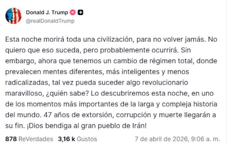 “Esta noche morirá toda una civilización, para no volver jamás. No quiero que eso suceda, pero probablemente ocurrirá”, introdujo el republicano en su cuenta de Truth Social.