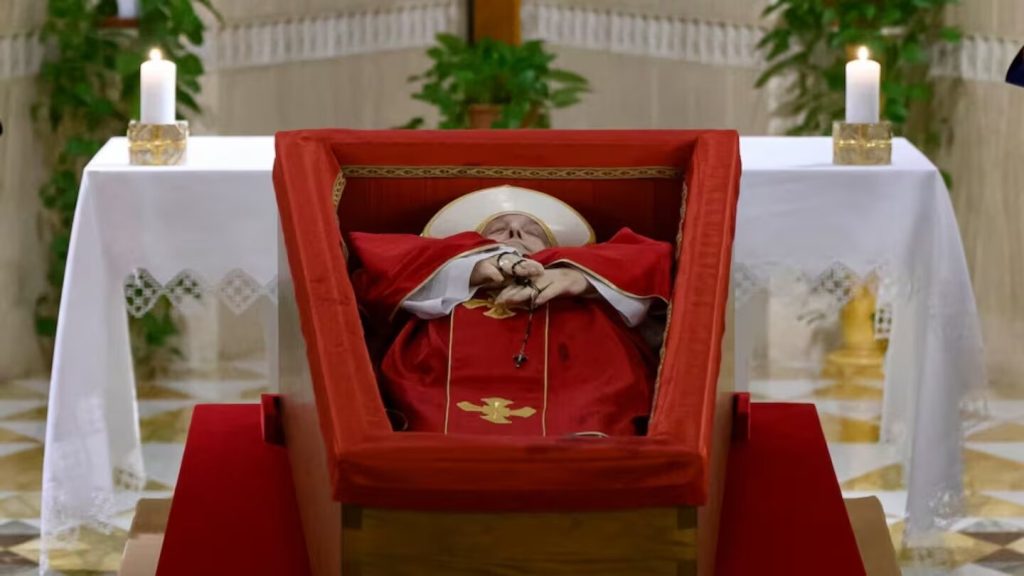 En las fotos se puede ver a Jorge Bergoglio vestido con una túnica roja, con una mitra blanca sobre la cabeza y un rosario negro entrelazado en sus manos. Al lado del ataúd se encuentra cardenal Kevin Farrell bendiciendo al pontífice.