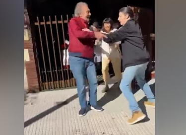 El video se detiene cuando el jubilado está a punto de golpearla y se reanuda poco segundos después, cuando el agresor se encontraba en el interior de su casa junto a su mujer, que intentaba calmarlo.
