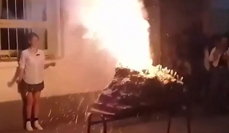 El hecho que conmocionó a la localidad fue grabado por uno de los asistentes y en el video se observa el momento en el que docentes encendieron el artefacto y segundos después explotó, lo que generó corridas y gritos.