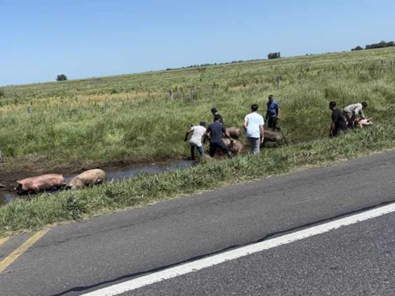 El camión quedó completamente destruido, con la jaula partida y los animales esparcidos por el terreno. Algunos cerdos deambulaban desorientados, otros permanecían inmóviles. Apenas se conoció la noticia del accidente, automovilistas que transitaban por la zona y vecinos de las inmediaciones comenzaron a acercarse.