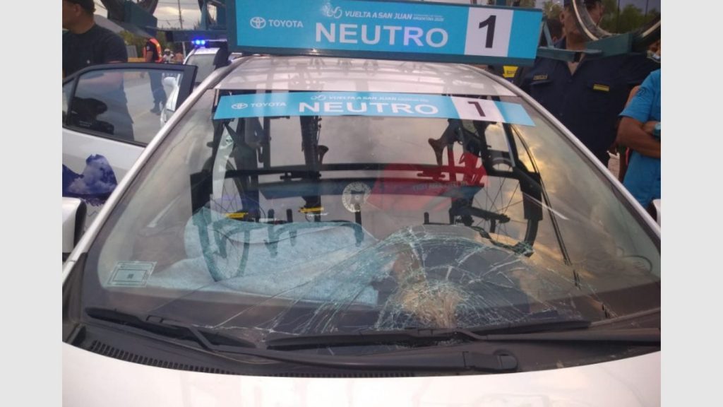 Según fuentes policiales, el auto es un Toyota Corolla que circulaba por Ignacio de la Roza en dirección al Este y corresponde a la organización de la Vuelta a San Juan.