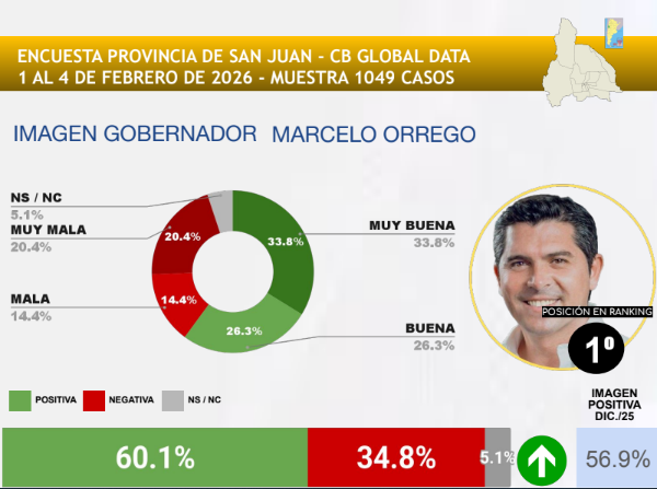 Según un relevamiento difundido por CB Global Data, el gobernador de San Juan, Marcelo Orrego, se ubicó en el primer lugar del ranking nacional de gobernadores con mejor imagen, correspondiente a febrero de 2026. El mandatario sanjuanino alcanzó un 60,1% de imagen positiva, liderando la evaluación entre los 24 distritos del país.