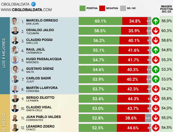 El estudio posicionó a Orrego en lo más alto, seguido por Osvaldo Jaldo (Tucumán) con 58,5%, Claudio Poggi (San Luis) con 56,2%, Raúl Jalil (Catamarca) con 55,1% y Hugo Passalaqua (Misiones) con 54,7%. El desempeño del gobernador sanjuanino se destacó por superar la barrera del 60% de aprobación, una cifra que lo diferenció del resto del podio.