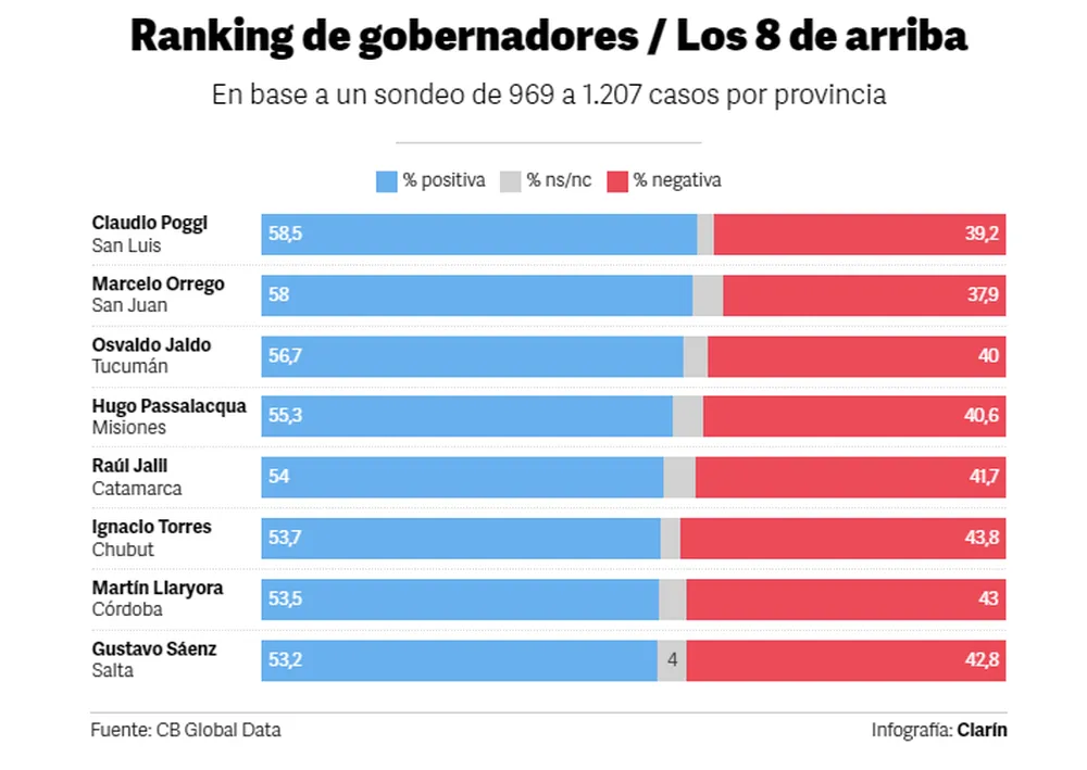 El informe vuelve a reflejar una tendencia habitual en la política argentina: los gobernadores suelen tener mayor nivel de aprobación dentro de sus provincias que los dirigentes nacionales, lo que explica que 20 de los 24 mandatarios evaluados tengan más imagen positiva que negativa en esta medición.