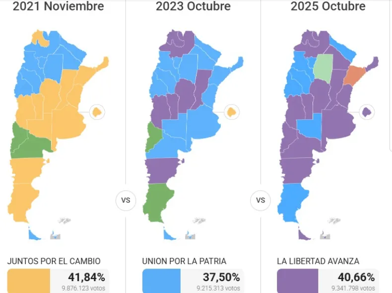 Los votos de LLA incluyen los obtenidos en las 23 provincias y la Ciudad Autónoma de Buenos Aires, donde se presentó en solitario o bajo distintas alianzas provinciales. Por su parte, el peronismo compitió con diversas denominaciones locales —como Fuerza San Juan, Fuerza Santacruceña, Frente Pueblo o Unidos Podemos—, pero no logró frenar el avance del partido violeta, que hoy emerge como la principal fuerza política del país