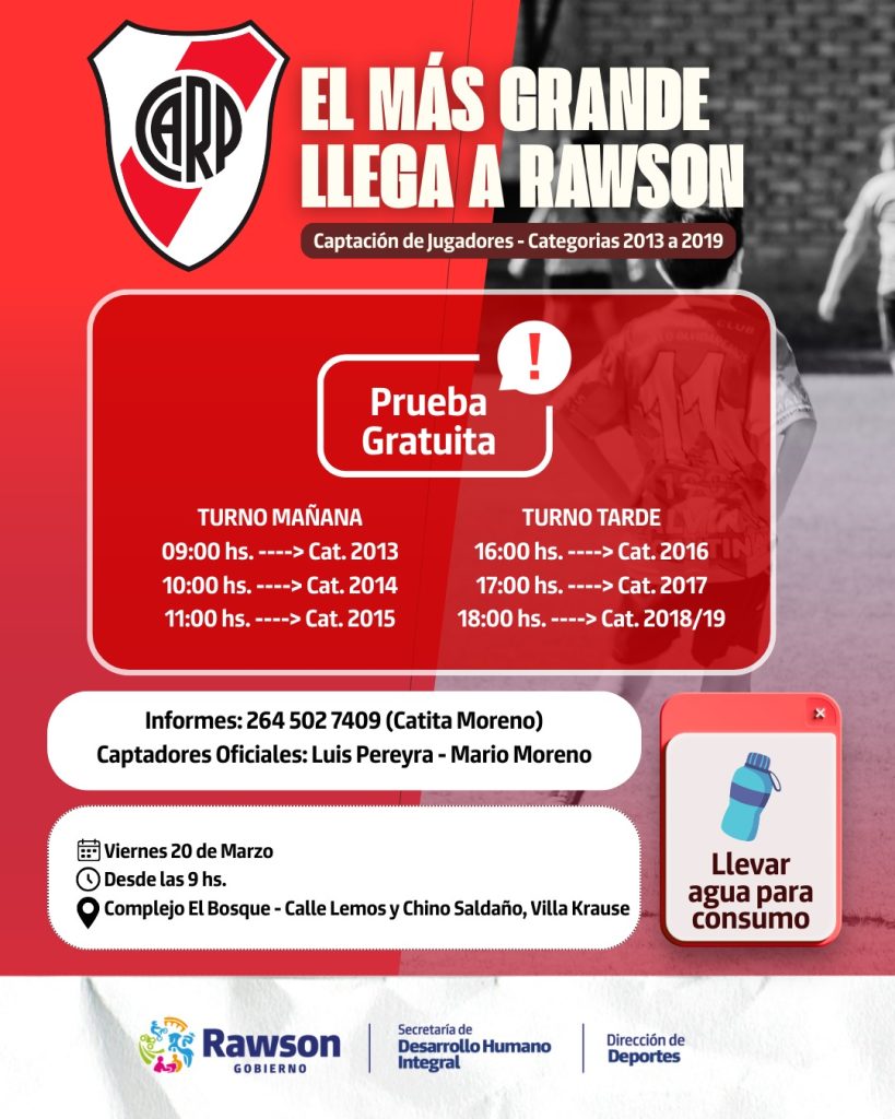 El sueño de llegar al fútbol profesional tendrá una nueva oportunidad para los jóvenes sanjuaninos. El Club Atlético River Plate realizará una jornada oficial de captación de talentos en el departamento Rawson, destinada a niños de distintas categorías que deseen mostrar su potencial ante los captadores del club.