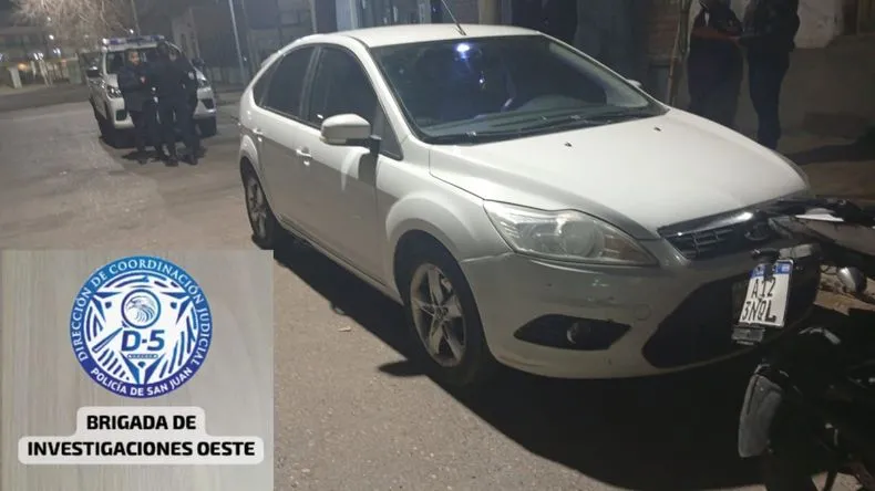 Hace una semana, una vecina del departamento Rawson denunció el robo de su automóvil, un Ford Focus blanco, que había sido sustraído mientras estaba estacionado frente a su vivienda. A partir de la denuncia, personal de la Brigada de Investigaciones Oeste inició una rápida pesquisa que permitió localizar el vehículo.