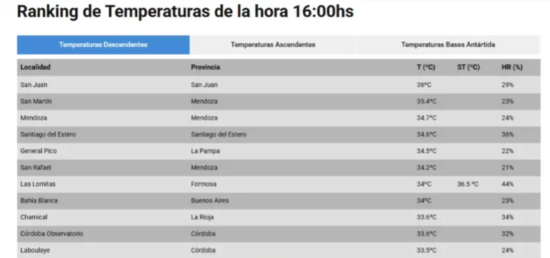 San Juan volvió a destacarse este miércoles como una de las provincias más calurosas del país. Según el Servicio Meteorológico Nacional (SMN), con la actualización de las 16, la temperatura alcanzó los 36°C, acompañada por un 29% de humedad, ubicando a la provincia en el primer lugar del ranking nacional.