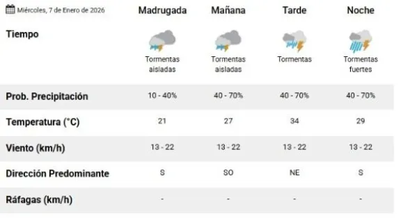 Para el miércoles, el mal tiempo se mantendrá durante gran parte del día, con especial intensidad hacia la noche. En tanto, el jueves se presentará con una marcada baja de la temperatura, con una máxima cercana a los 28 grados, y continuará la probabilidad de tormentas, especialmente durante la madrugada y la mañana.