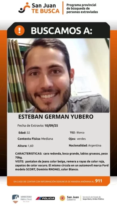 El programa provincial de búsqueda de personas extraviadas “San Juan te busca” informó la desaparición de Esteban Germán Yubero, de 32 años, quien fue visto por última vez el miércoles 10 de septiembre.