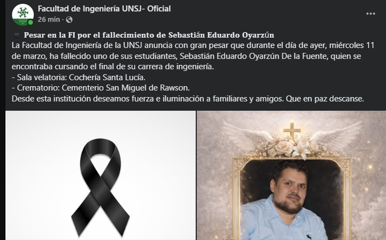 La Facultad de Ingeniería de la Universidad Nacional de San Juan confirmó con profundo pesar el fallecimiento de un estudiante, ocurrido durante la jornada del miércoles 11 de marzo, lo que generó conmoción en la comunidad universitaria.