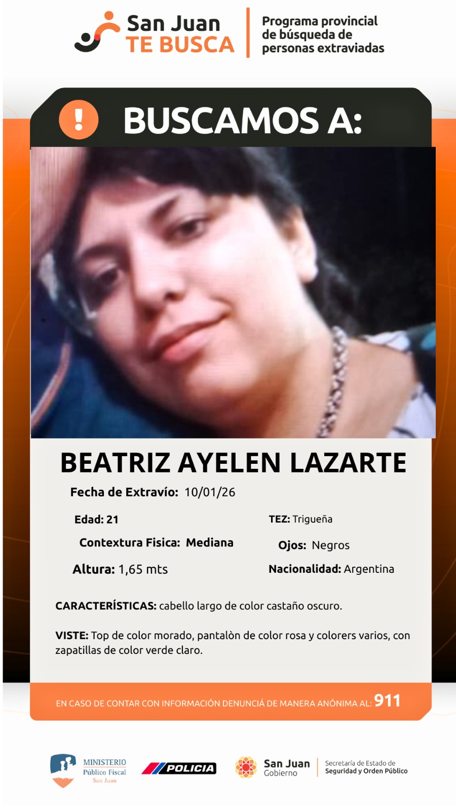 El programa provincial San Juan Te Busca emitió un pedido de colaboración para dar con el paradero de Beatriz Ayelén Lazarte, una joven de 21 años que se encuentra desaparecida desde el 10 de enero de 2026.