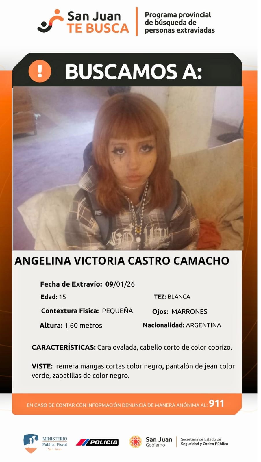 Desde el Ministerio Público Fiscal y la Policía de San Juan solicitaron la colaboración de la comunidad. Cualquier persona que pueda aportar datos sobre su paradero puede comunicarse de manera anónima al 911.