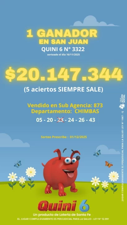 El jugador obtuvo un premio de $20.147.344 tras acertar cinco números en el sorteo N° 3322. La apuesta fue realizada en la subagencia 873, ubicada en el departamento Chimbas.
