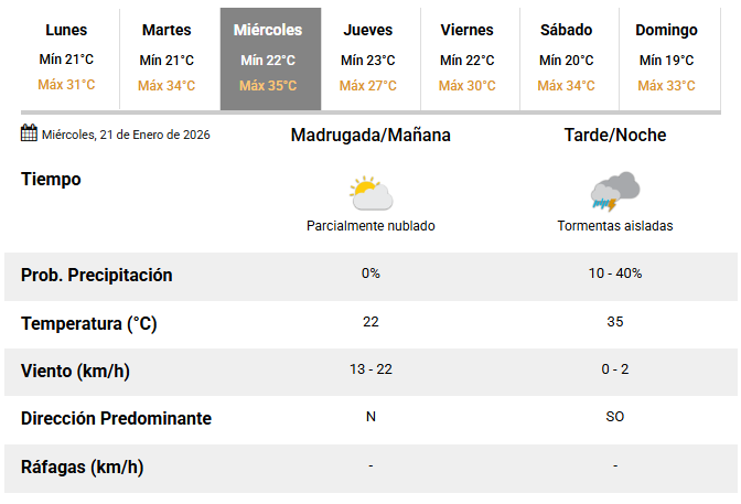 El miércoles se perfila como el día más inestable de la semana. Si bien durante la mañana el cielo se mantendrá parcialmente nublado, hacia la tarde y la noche se espera nuevamente la probabilidad de tormentas, con temperaturas que podrían alcanzar los 35°C.