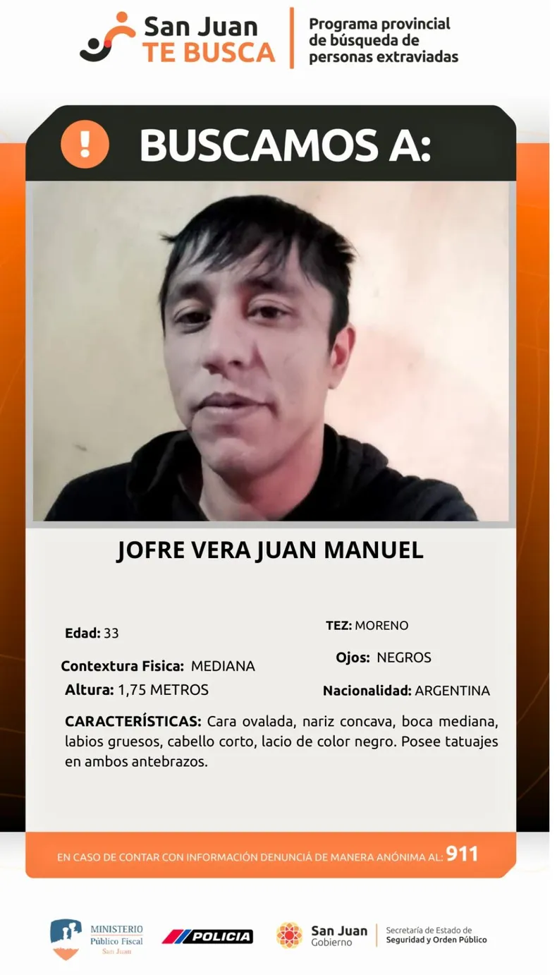 Por otra parte, las autoridades también intensificaron la búsqueda de Juan Manuel Jofre Vera, de 33 años, quien mide cerca de 1,75 metros, es de contextura mediana, tez morena, ojos negros y cabello corto, lacio y negro. Como seña particular, presenta tatuajes en ambos antebrazos.