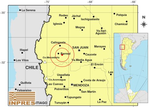 El epicentro fue ubicado 17 km al Este de Barreal, 78 km al Oeste de la Ciudad de San Juan y 137 km al Norte de Mendoza, dentro del departamento Calingasta. El sismo ocurrió a una profundidad de 127 km, según el informe oficial del INPRES.