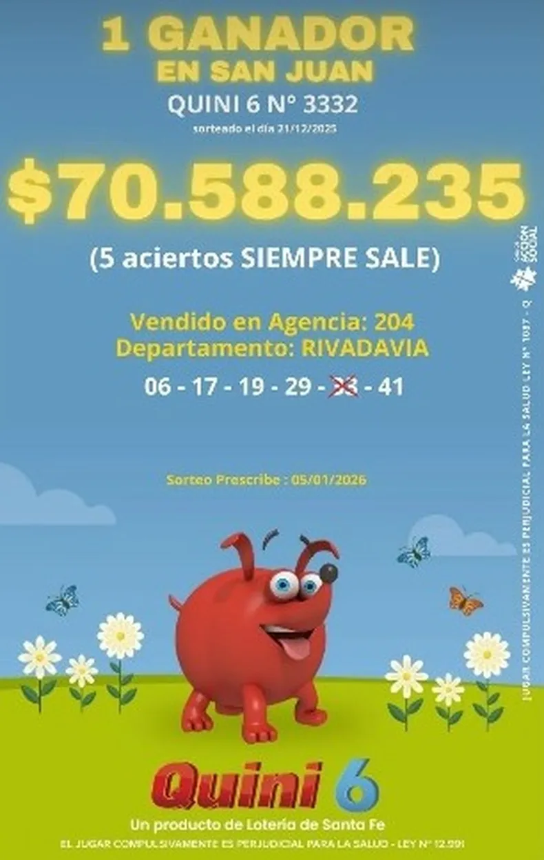 San Juan volvió a ser noticia por un importante golpe de suerte. En el último sorteo del Quini 6, un apostador de la provincia se convirtió en millonario al acertar cinco números en la modalidad Siempre Sale, llevándose un premio que supera los 70 millones de pesos.