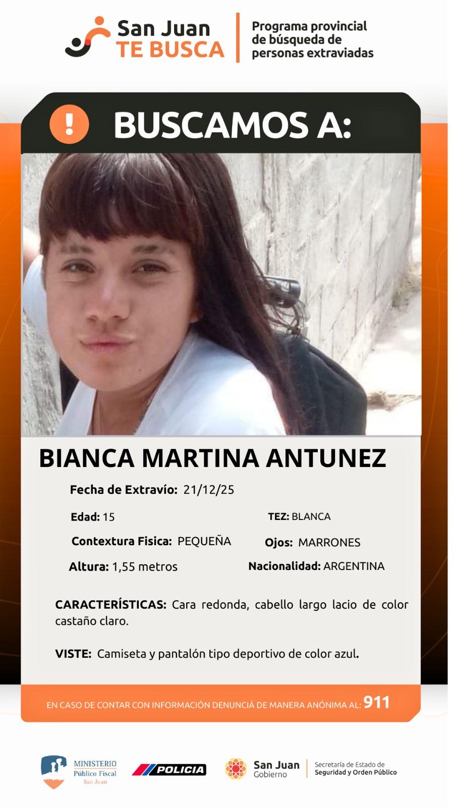 La Policía de San Juan continúa con un operativo de búsqueda para dar con el paradero de Bianca Antúnez, una adolescente de 15 años que se encuentra desaparecida desde la tarde del domingo 21 de diciembre, cuando se ausentó del domicilio de su tía, quien ejerce su guarda, en el barrio Santa María, departamento Chimbas.