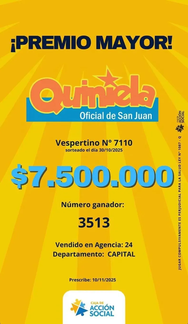 La suerte volvió a sonreírle a San Juan: un apostador local se llevó un premio de $7.500.000 tras acertar el primer lugar en la Quiniela Vespertina. El billete ganador, jugado en una agencia de Capital, tenía el número 3513, según confirmó la Caja de Acción Social.