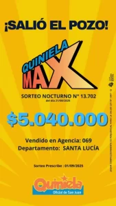 Un apostador de Santa Lucía se llevó el pozo de Quiniela Max, correspondiente al sorteo nocturno N° 13.702 del pasado 21 de agosto, según confirmó este viernes la Caja de Acción Social.