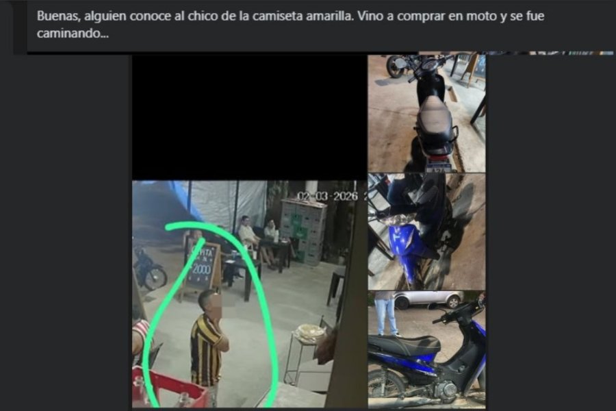 A través de un grupo vecinal, los comerciantes publicaron una captura de la cámara de seguridad donde se observa a un cliente esperando pacientemente su turno. Junto a la imagen del muchacho —que vestía una llamativa remera a rayas amarillas y negras— compartieron varias fotografías de una motocicleta azul de 110 cilindradas, estacionada e intacta en la puerta del local.