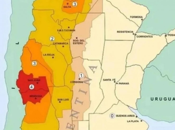 El nuevo relevamiento clasifica al territorio argentino en cinco niveles de amenaza, que van del 0 (muy bajo) al 4 (muy alto). En esta escala, el norte de Mendoza y el sur de San Juan aparecen marcados con rojo intenso, lo que representa el nivel 4 de peligrosidad. Estas zonas concentran la mayor frecuencia y magnitud de movimientos telúricos, producto de la fuerte interacción entre placas tectónicas bajo la cordillera de los Andes.