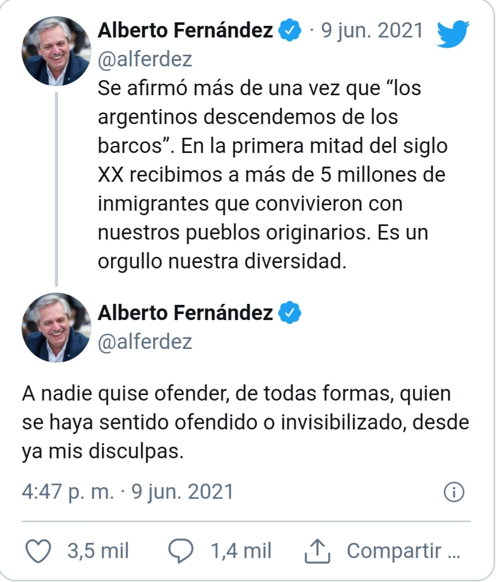 “A nadie quise ofender, de todas formas, quien se haya sentido ofendido o invisibilizado, desde ya mis disculpas”, escribió el Presidente. Hoy, en una conferencia con su par español Pedro Sánchez, Fernández aseguró citar al poeta mexicano Octavio Paz al afirmar: “Los mexicanos salieron de los indios, los brasileños salieron de la selva, pero nosotros, los argentinos, llegamos en los barcos de Europa”.