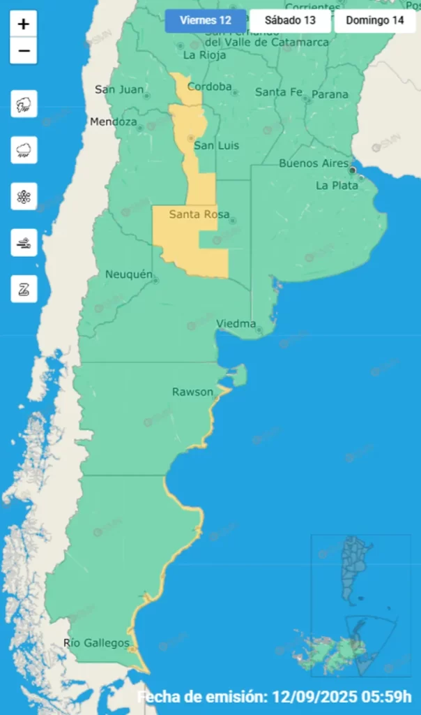 Se precisó que se esperan fuertes vientos fuertes del sector norte, con velocidades entre 35 y 45 km/h y ráfagas que pueden alcanzar los 75 km/h durante la tarde y la noche de este viernes. Las zonas afectadas serán las provincias de La Pampa, San Luis y La Rioja.