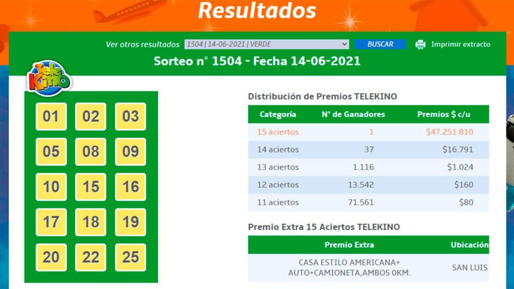 El cartón del Telekino que logró los 15 aciertos se vendió en Villa Mercedes, San Luis, y además se alzó con un auto, una camioneta y una casa estilo americana