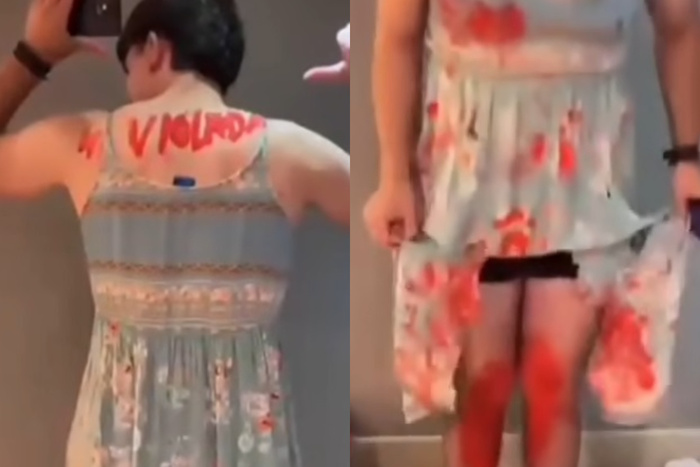 El vestuario intentaba emular a una mujer agredida sexualmente: llevaba un vestido celeste rasgado con manchas rojas que simulaban sangre y se extendían por la entrepierna y el resto del cuerpo, mientras que en su espalda tenía escrita en colorado la palabra “violada“.