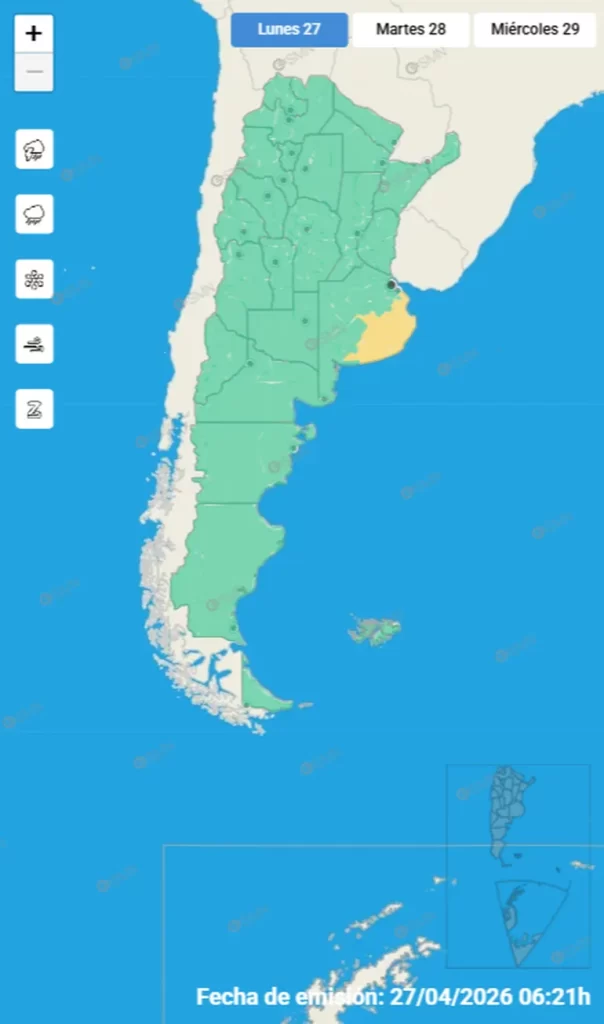La advertencia fue emitida para este lunes y abarca ciudades y zonas de influencia como Bahía Blanca, Coronel Rosales, Monte Hermoso, Villarino, Patagones, Coronel Dorrego, Tres Arroyos, Necochea y otras localidades cercanas a la costa atlántica bonaerense.