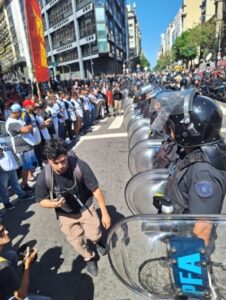 Mientras los militantes cantan “Milei basura vos sos la dictadura”, llegaron muchos efectivos policiales. El polo Obrero armó su propio cordón y se miran frente a frente a metro y medio de distancia.